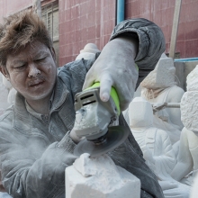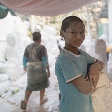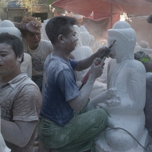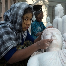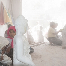 Outside the Mahamuni Temple in Mandalay, Myanmar there is a whole street where stone masons can be found toiling away on stone statues of Buddha. The working conditions there are truly atrocious, with little respect for the health of the workers or the general environment. Work is carried out without protective masks, protective gloves or any kind of dust extraction systems. It is disturbing to witness workers, especially children, labouring in such circumstances – their faces sweating and caked with a crust of choking dust. The result of breathing in these dangerous concentrations of dust will surely see these people suffering from lung diseases and other respiratory problems. An early death is almost certainly guaranteed . . .