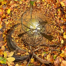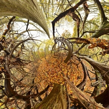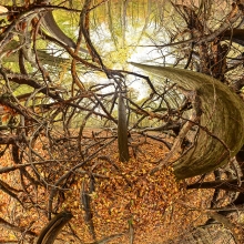 I have been photographing trees for a long time. Capturing within a single image my experience of being in a wood or forest, the sense of enfoldment, has oftentimes proved elusive: branches overhead veiling light, sky and the outer world; the random disposition of trees with trunks of diverse textures of bark; the ground beneath collecting everything that trees shed – leaves, seed pods, twigs and branches dislodged by wind, and ultimately whole trees fallen at the end of life. After much experimentation, I feel I have now arrived at one way to convey my own experience of trees.