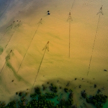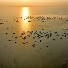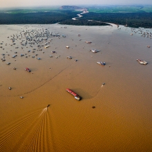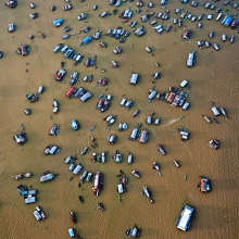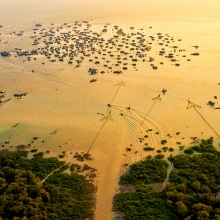 Series of aerial photographs taken at sunset of the northeastern area of Tonle Sap lake in Cambodia with the mouth of the Siem Reap river, fish traps and Chong Kneas floating village in the dry season when water levels are very low. Part of an extended series.