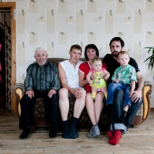 The starting point of Halasz’s project was the right-wing idea, widespread in his home country, that Hungarians originally came from the Ural region and spread from there to become the greatest and most feared warriors in Europe. Looking to create an ironic reflection on this idea, Halasz tried to find his supposed relatives among ordinary Udmurt families of the region. “Udmurts and Hungarians belong to the same family of Finno-Ugric people,” says Halasz. “Like the prodigal son in the Bible, I returned to the ancient land.” Depending on the setting, Halasz becomes a father, brother, uncle or son, temporarily older or younger. A wry take on questions of nationality and ideology becomes also an enquiry into the dynamics of family and the traditions of portraiture.”