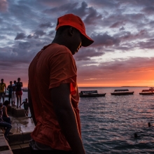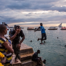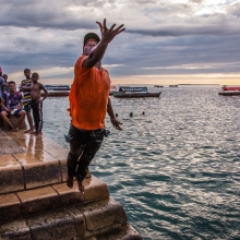 Stone Town is a muggy place during the rainy season, so when the tide is right, large groups of young men gather at the water's edge to jump and dive into the cooling Indian Ocean. Often they'll jump 5 or more quickly in a row, barely missing each other as they splash into the water. The whole scene is charged with energy and laughter as they seek to outdo each other on the style of their dives.