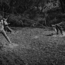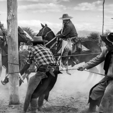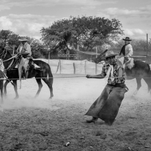 The pialada, the gaucho's utmost dexterity and agility demonstration. It consists in hurling a lasso (a rawhide rope) to an animal fleeing away, taking advantage in the split second when it lifts its back legs to run, and thus hold them, so as to immobilize and knock it down.